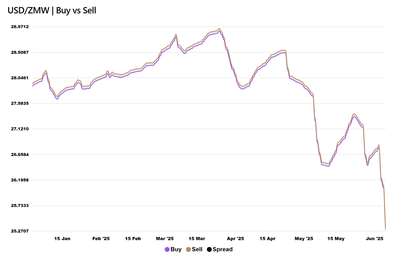 The most important foreign exchange rate in all economies is the underlying currency’s performance against the USD, and Zambia is no different. Since the beginning of 2025, the kwacha has appreciated immensely against the USD, in particular, 9.30% which is the largest magnitude of all. This follows the aforementioned trend of disinflation and lowering bond yields, as it signals more confidence and demand for the Zambian Kwacha. The rate also peaked in February and began the trend of appreciation during and post the first recording of disinflation in the economy as highlighted below in fig. 4 with a stable spread of around 490 to 500 pips, unlike the more variable spread and rates showing with the other tracked currencies (GBP, EUR, and ZAR).