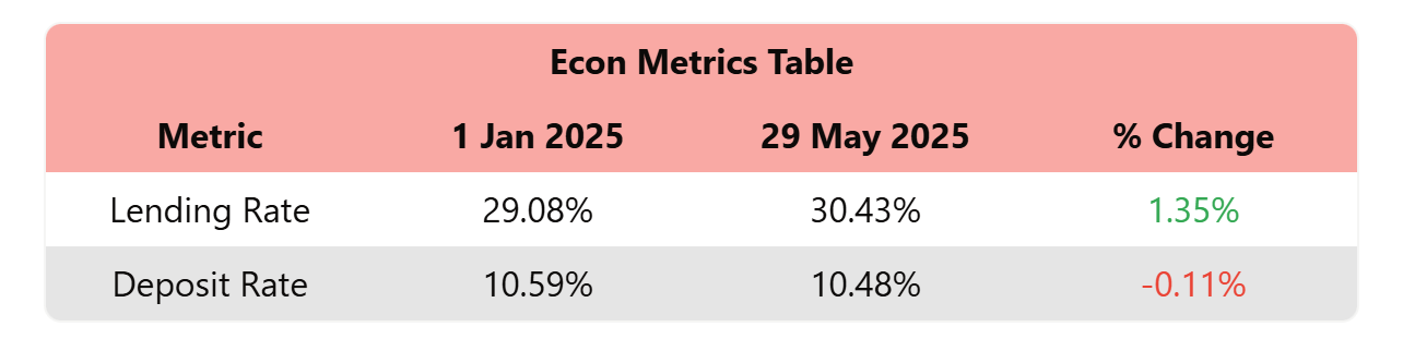 The deposit rate reduced disincentivizing savings staying within a small margin of 10.48% - 10.59%, whilst the lending rate increased significantly from 29.08% to 30.43% and we project this rate to only increase to roughly 32.00% over the coming months. A true anomaly in an economy, where surface level signals report recovery and strength, but realistically there is no such thing.